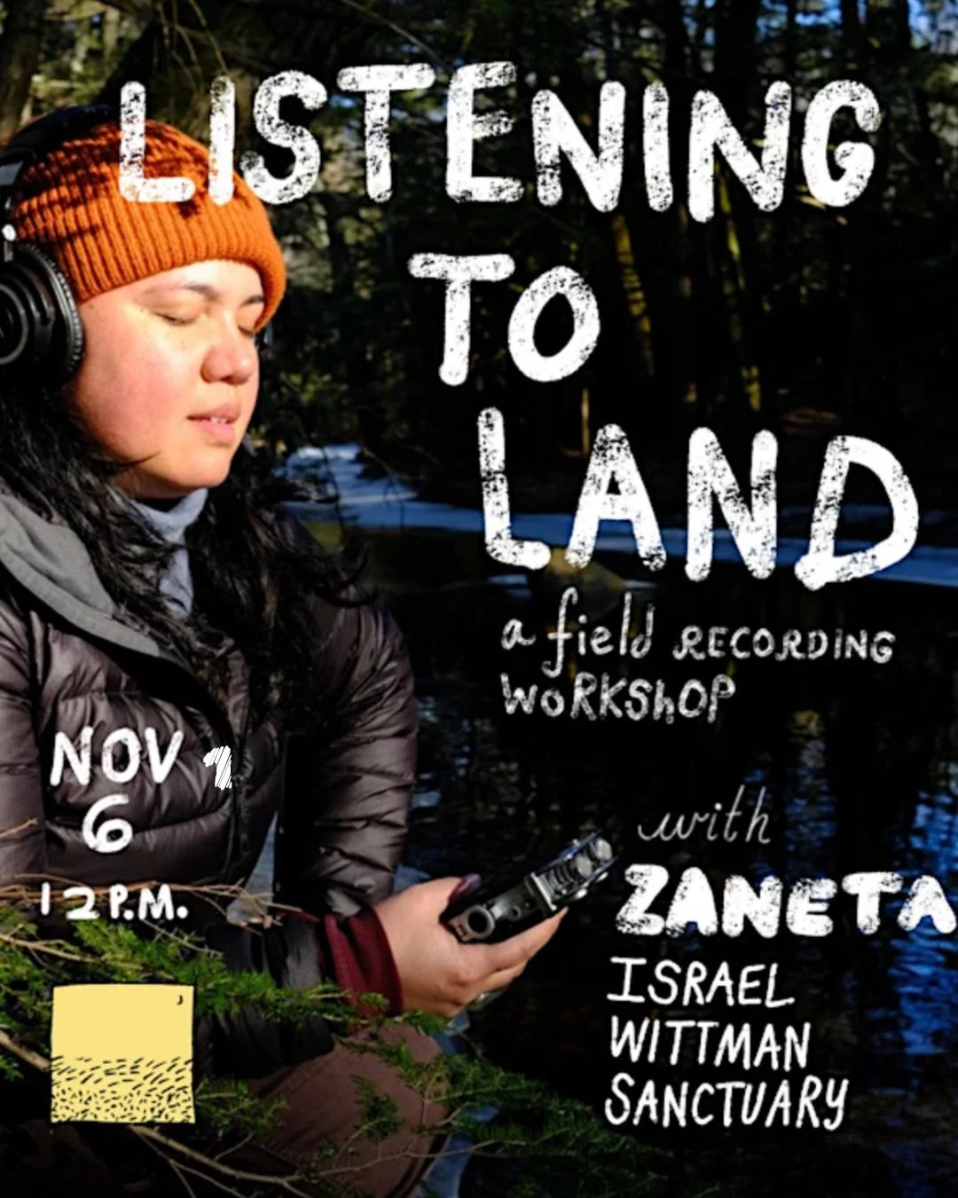 Join us for Listening to Land, a field recording workshop led by local sound-artist Zaneta Sykes (they/them) at Israel Wittman Sanctuary. This immersive outdoor experience invites participants to deepen their relationship with the natural world through attentive listening and the practice of recording ambient sound. Guided by Zaneta’s expertise in eco-acoustic art and mindful soundwalking, the group will explore how sound can reveal hidden dimensions of a landscape. No prior experience is necessary.